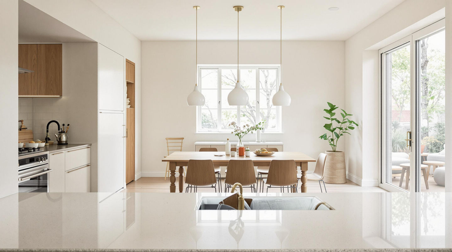 A contemporary kitchen showcasing warm wood tones, sleek countertops, and open shelving. The design emphasizes practicality without compromising style, featuring natural textures and soft lighting for a homely yet modern atmosphere.